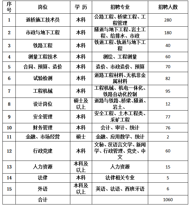 因公路工程施工、铁路、港航、地下工程、设计、养护等业务发展需要,诚聘下列专业技术人才。